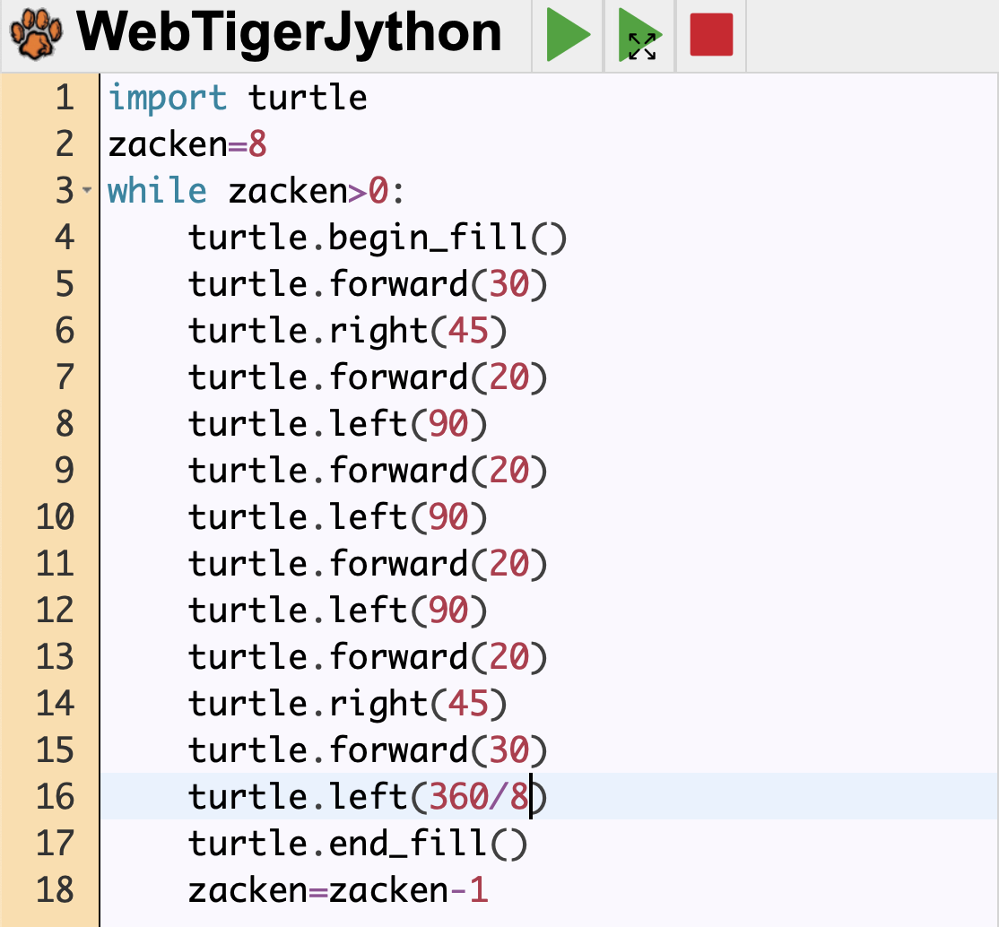Programmieren Sie mithilfe einer while-Schleife (Wiederholungsanweisung) die Python-Turtle so, dass sie einen einfachen Stern mit acht Zacken, wie unten abgebildet, zeichnet.