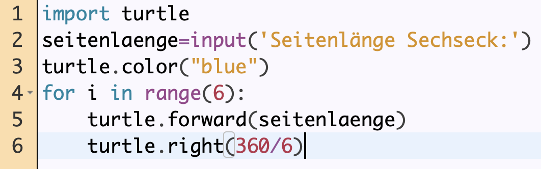 Programmieren Sie mittels einer Schleife ein Sechseck. Die Seitenlänge soll vom Nutzer eingegeben werden. Das Sechseck soll eine blaue Linienfarbe haben.