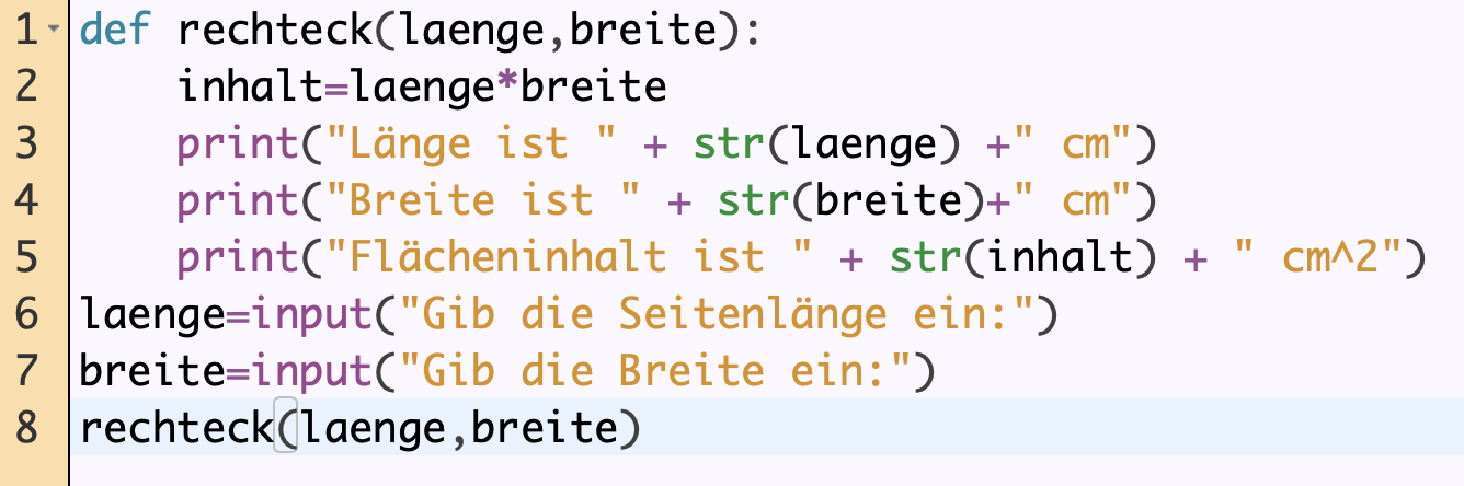 Erstelle ein Python-Programm, das ein Modul enthält, mit dem die Fläche eines Rechtecks berechnet wird. Der Nutzer gibt die Länge und Breite ein. Die Ausgabe soll z. B. wie folgt aussehen:
