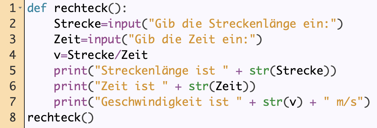 Erstelle ein Python-Programm, das eine Funktion enthält, um die Geschwindigkeit eines Objekts zu berechnen. Der Nutzer gibt die Strecke und Zeit ein. Die Ausgabe soll z. B. wie folgt aussehen: